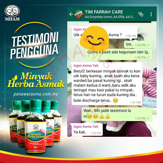 Namun, pengguna Minyak Herba Asmak kini boleh menggunakan Minyak Herba Asmak ini pada bayi anda. Beberapa testimoni telah kami perolehi daripada pengguna yang sudah menggunakan Minyak Herba Asmak sebagai ikhtiar untuk mengurangkan kuning bayi mereka.